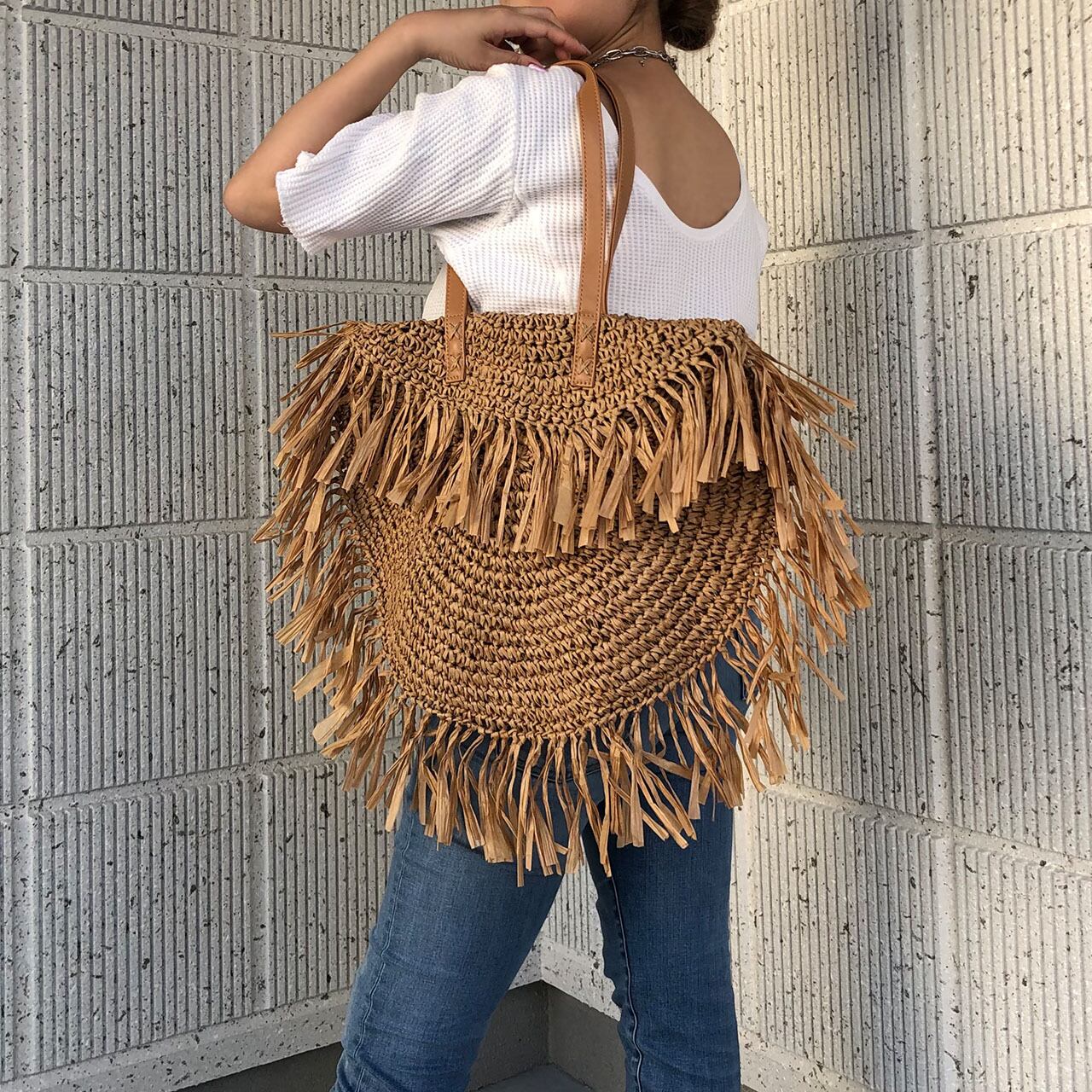 天然素材の大振りのフリンジがお洒落でかわいい円形のトートバッグです。