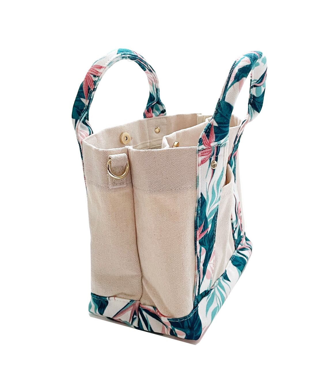 LA発サーフアーティスト「Jessica Miyuki(ジェシカ・ミユキ)」のアートがデザインされたバッグの中に、入れる物によって仕切りが調整できるミニトート。ボタン式で間仕切りが取れるので、お弁当箱などマチの大きい物を入れる時は間仕切りを外して、 小さな小物類が多い時は仕切りを付けて使える3WAY仕様!開口部はマグネットボタンを採用する事で、中身が見えにくく、防犯性も高まります。便利な内ポケットもついています。取り外し可能なショルダーベルトが付属しているので肩がけもおすすめ。