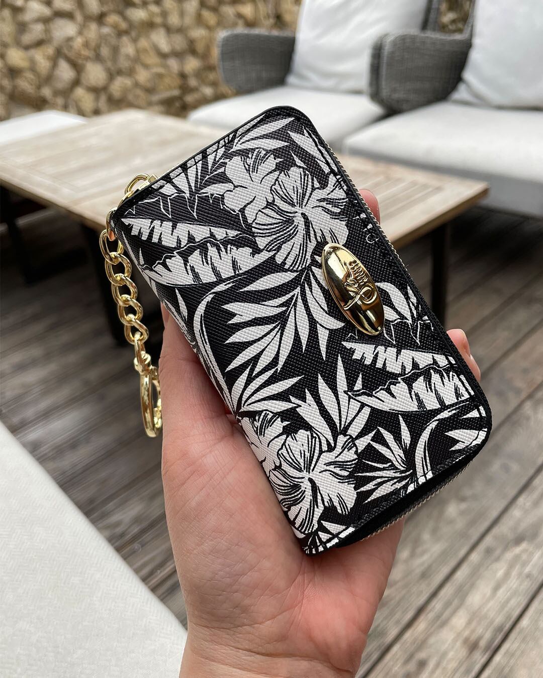 ハート型のチェーンがついたJessica Miyuki(ジェシカ・ミユキ)アートデザインのキーケースです。内側は6連のキーチャームに加え、スマートキーなどが取り外しできるキーリング、2連のキーチェーン、カードポケットもついています。1つでカギやカードが収納できる優秀アイテムです。