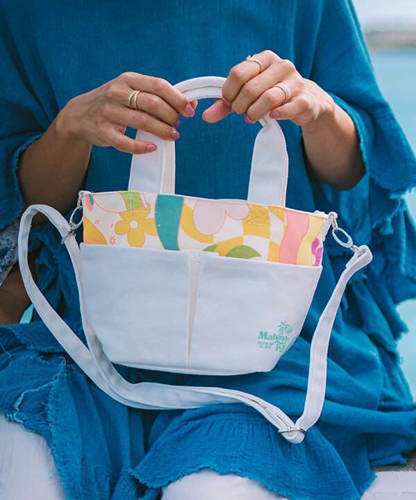 トロピカルアーティスト「Mahinaily(マヒナアイリー)」のアートがデザインされたミニトートです。外側の2つのポケットは大きめになっており、マチもしっかりあるので収納に便利なアイテムです。アートに合わせたカラーがおしゃれなデザイン。取り外し可能なショルダーもポイントです。